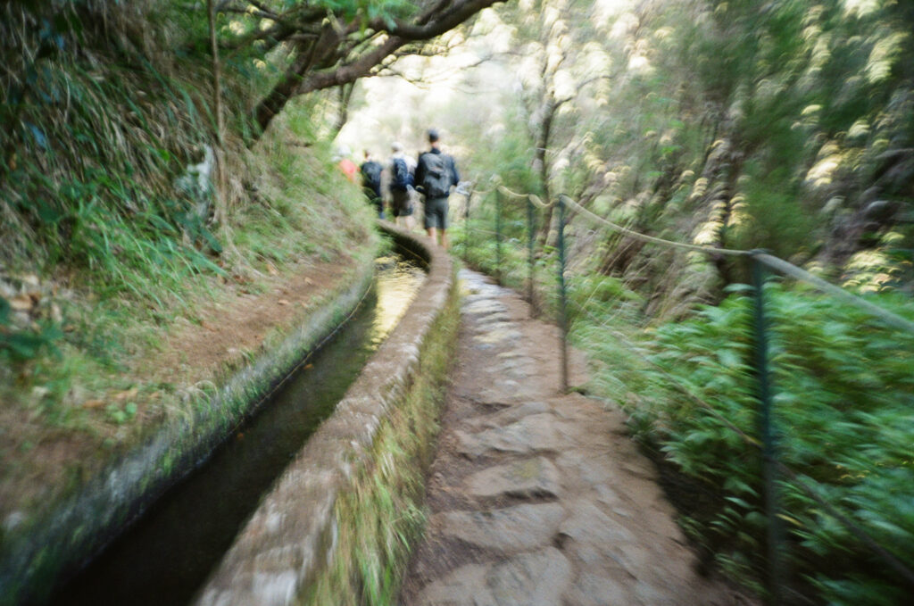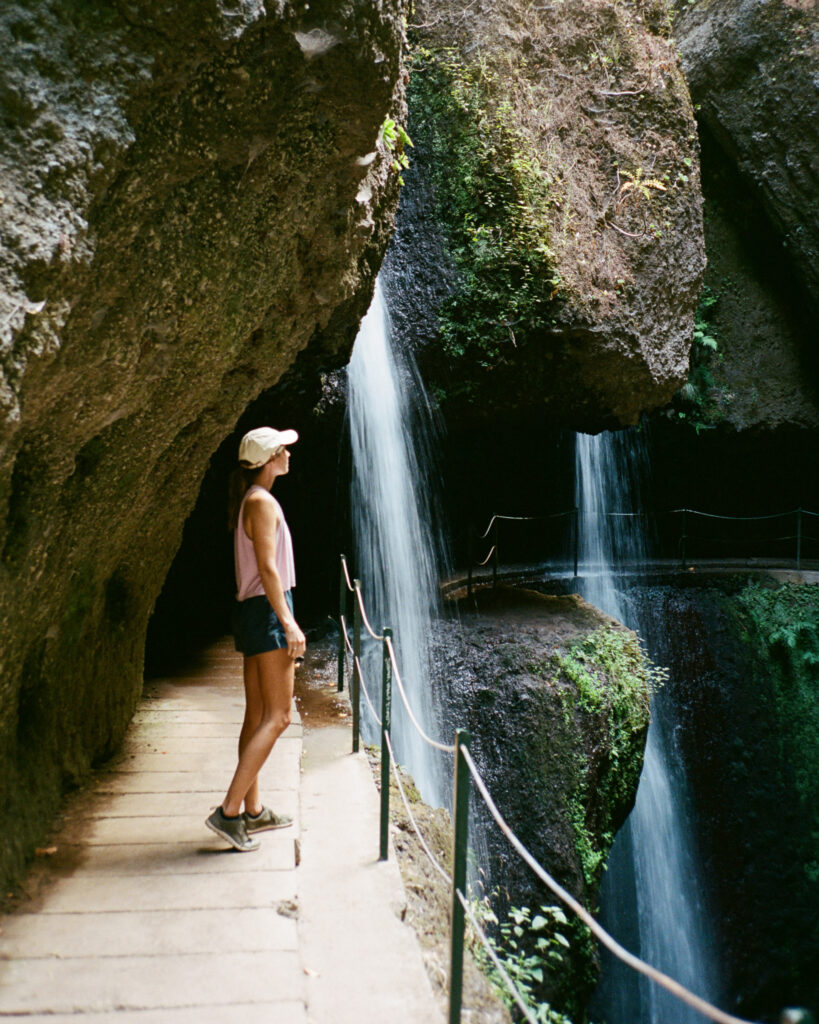 The Levada Nova + Moinho trail is a circular route that winds along the water channel, out along cliff edges with dizzying views down to the coast, and through a couple of waterfalls where you can stop and just stand there for a moment while the mist hits your face. One of those waterfalls drapes right over the trail, so you’re basically walking underneath it.