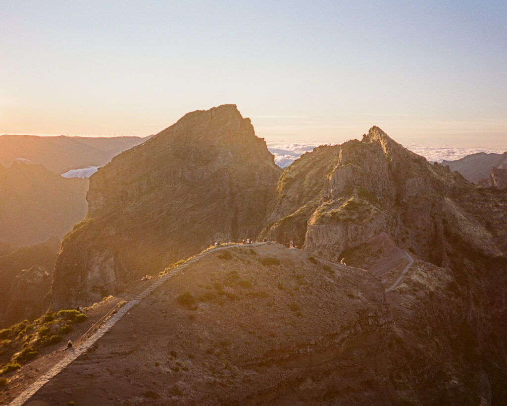 Pico do Arieiro is about a 45 minute drive from Funchal. The first section of PR1 includes the stretch people call the “Stairway to Heaven,” a series of stone steps climbing through the clouds above Madeira’s central mountain range. You’re walking above a sea of clouds with peaks poking through on every side. A lot of people recommend going at sunrise, but we went at sunset and the views were awesome. There’s something to be said for watching the light change over the mountains without a 4am alarm attached to it. There was a fairly large group of people watching the sunset from the trailhead that made it seem like an evening ritual.